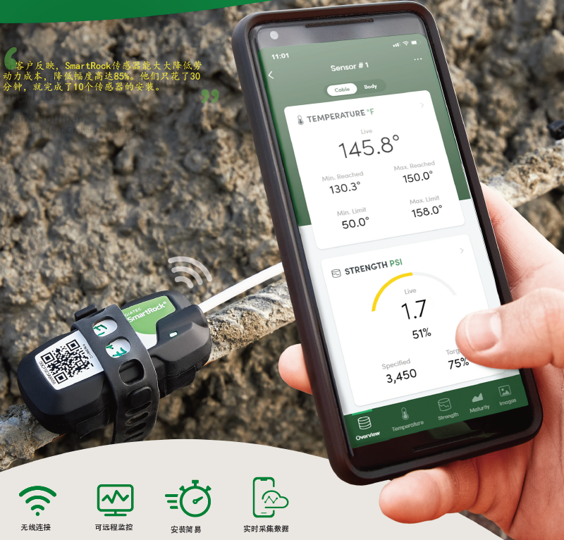 相对于Smartrock2,进一步优化,它的无线传输性能更强(信号强50%),激活使用操作更简单(拔除探头即可激活,插入后断电),安装固定更加方便(自带宽扎带,便于固定在钢筋上)